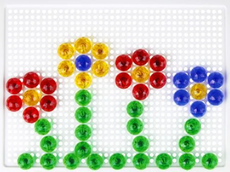 LENA® Mosaik Set transparent 15 mm. Bestehend aus 80 bunten,15 mm großen Steckern inkl. Aufbewahrungsbeutel und Steckplatte: 21 x 16cm.