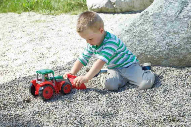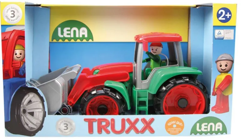 Der Traktor mit Frontschaufel hat ebenfalls viele Spielfunktionen, neben den Hartreifen und Metallachsen.