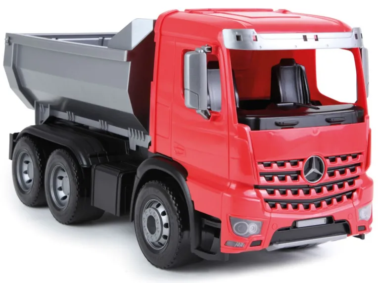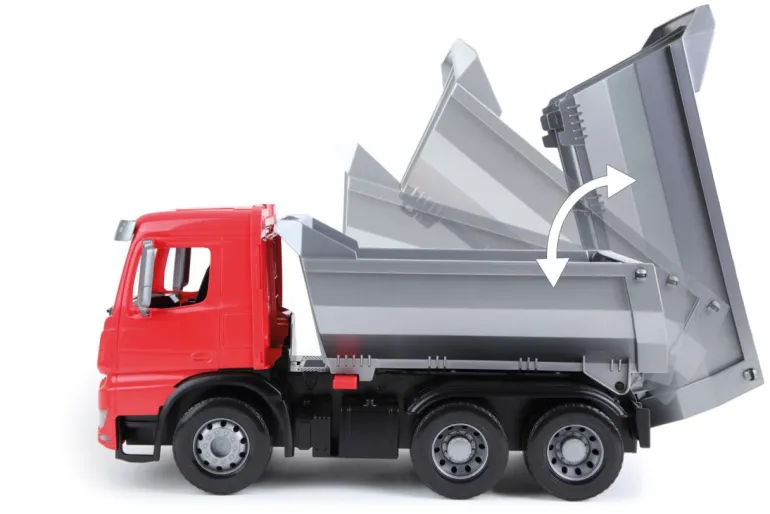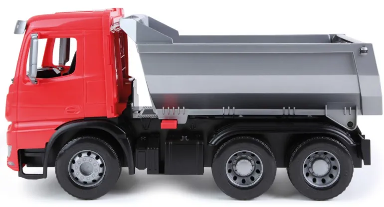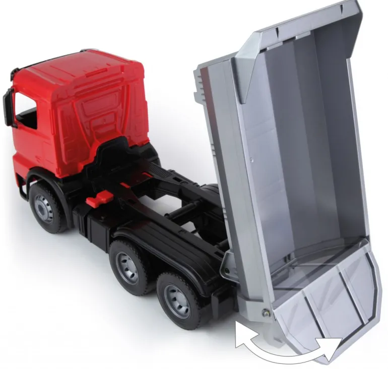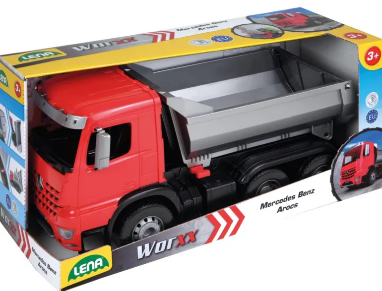 LENA® Worxx Muldenkipper Actros, der 3 Achser besitzt eine verriegelbare flache Kippmulde, mit 6 mm verzinkten Stahlachsen. Länge: ca. 45 cm. Geeignet für Kinder ab 3 Jahren. Indoor & Outdoor geeignet.