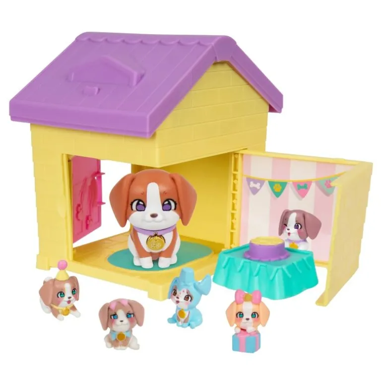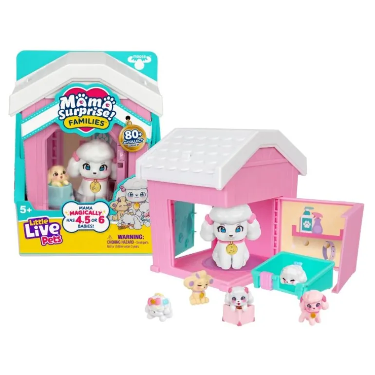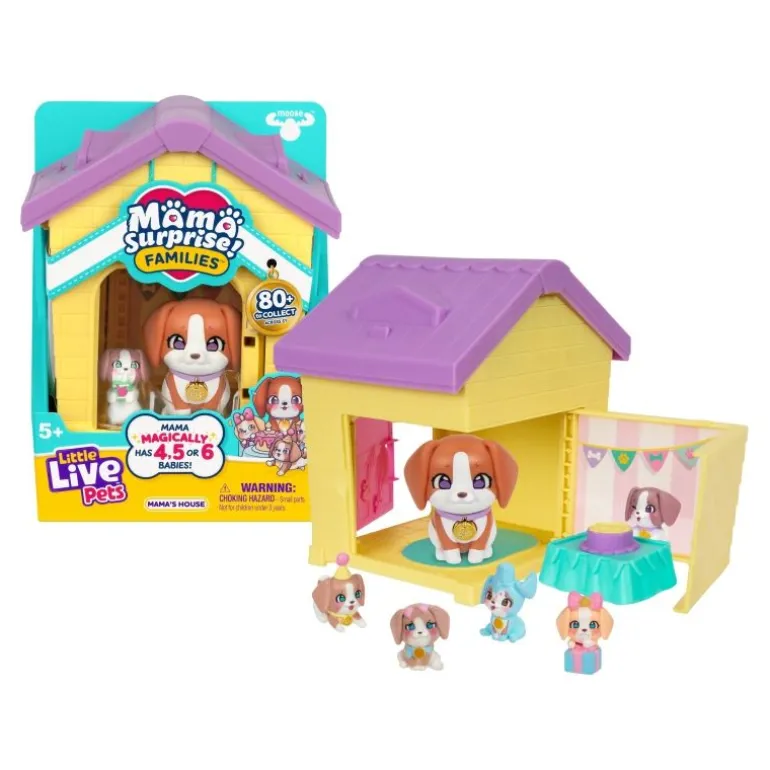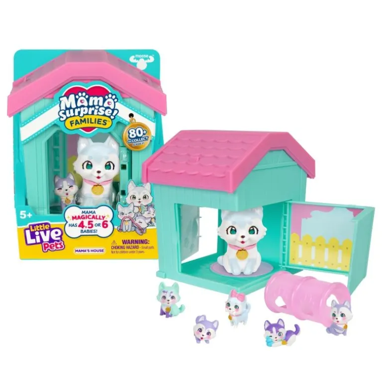 Little Live Pets – Mama Surprise Families – Mamas Hütte-Packung. Setze Mama in ihre Hütte und öffne die Tür immer und immer wieder, um 4, 5 oder 6 Babys wie von Zauberhand zu enthüllen! In der 1. Serie gibt es über 80 Mamas und Welpen zum Sammeln! Mama bekommt wie von Zauberhand 4, 5 oder 6 Babys. Wie viele wirst du wohl finden? Bereite Mama darauf vor, ihre Babys zu enthüllen, indem du ihre Wangen mit Wasser abwischst – sie werden dann rosig!