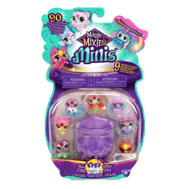 „Willkommen im Shimmerverse! Die Mixies laden dich ein in ihre zauberhafte Welt voller Magie und endlosem Spielspaß. Magic Mixies Minis sind zwar sehr klein, doch davon solltest du dich nicht täuschen lassen: Sie haben riesige Überraschungen für dich parat! Bist du bereit, mit den schelmischen Minis jede Menge magische Abenteuer zu erleben? Es gibt 90 Magic Mixies Minis zum Sammeln und 5 neue Zauberkräfte: Sternenlicht, Eis, Sonne, Regenbogen und Mondstein. Jede Zauberkraft wird auf eine andere magische Weise enthüllt: durch ein Leuchten, durch ein Funkeln oder durch einen Farbwechsel. Und wer weiß … vielleicht findest du sogar das aufleuchtende Mini Heira aus der Limited Edition! Die Magic Mixies Minis 9er-Packung enthält 9 Minis-Spielzeugfiguren, darunter 1 Regenbogen-Mini-Mixie in Sonderedition. Du hast jetzt die Aufgabe, einen blubbernden Zaubertrank zusammenzubrauen, um die 2 versteckten Magic Mixies Minis in deinem magischen Kessel zu enthüllen. Sammle alle 90 Magic Mixies Minis und schließ dich ihren Abenteuern durch das Shimmerverse an, um eine Welt voller Magie zu entdecken.