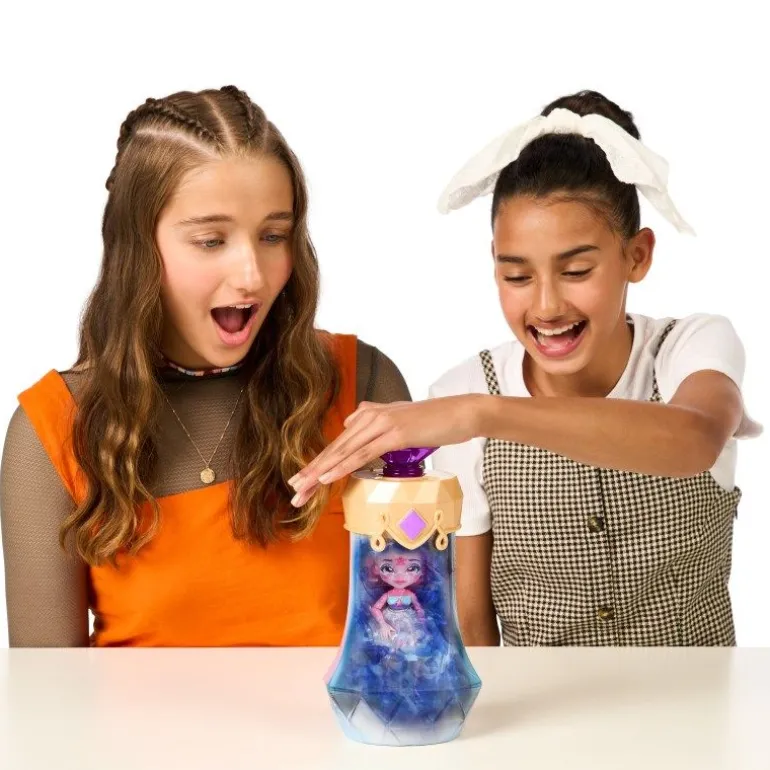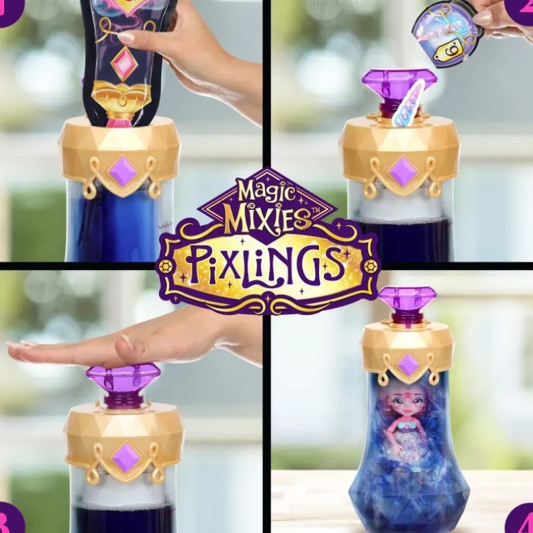 Tauche ein in die zauberhafte Welt der Magic Mixies Pixlings, braue einen Zaubertrank und enthülle deine magische Pixlings-Puppe Unia! Dein Pixling sorgt stets für Freude und magische Momente – sie kommt aus einem Land, in dem magische Zaubertränke aus Wasserfällen und Brunnen sprudeln. Braue deinen eigenen Zaubertrank und enthülle deine wunderschöne Pixling-Puppe auf magische Weise. Gib dazu einfach die magischen Zutaten in die Zaubertrank-Flasche, füge Wasser hinzu und rühre die Mischung um. Der Zaubertrank vermischt sich dann in der Flasche und färbt sich tiefblau. Sprich anschließend die magischen Worte „Magicus Mixus”. Drehe dabei den Kristall und drücke ihn danach.