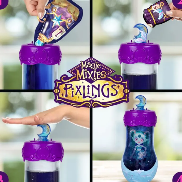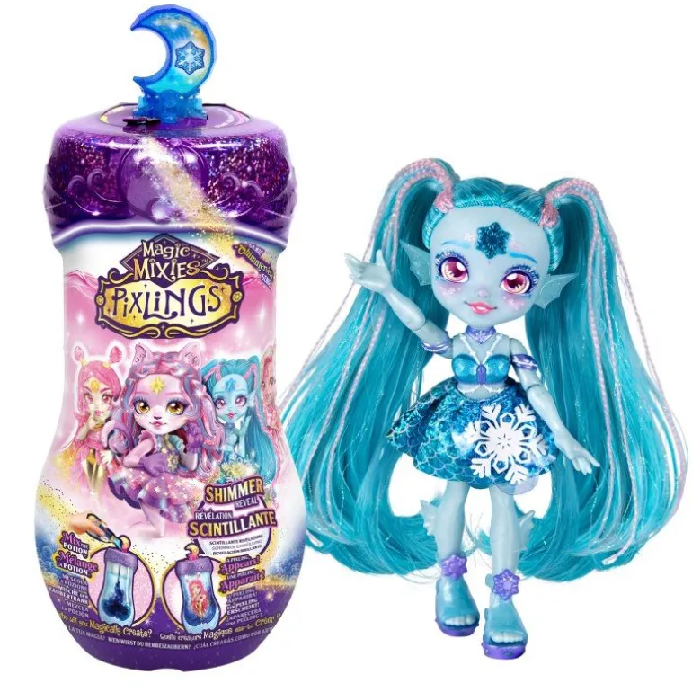„Willkommen im Shimmerverse! Die Pixlings laden dich ein in ihre zauberhafte Welt voller Magie und endlosem Spielspaß. Welches Magic Mixies Pixling wirst du herbeizaubern, wenn du einen schimmernden Zaubertrank braust und eine Pixling-Puppe enthüllst? Gib für den Zaubertrank einfach die magischen Zutaten in die Flasche, füge Wasser hinzu und rühre die Mischung um. Der Trank blubbert und verwandelt sich in eine schimmernde, dunkelblaue Mixtur. Sprich die magischen Worte „Magicus Mixus“, während du am Kristallmond-Aufsatz drehst und ihn herunterdrückst. Der Trank klart auf und das Pixling wird enthüllt! Diese zauberhafte Pixling-Puppe lässt sich einfach aus der Flasche entnehmen und ist komplett trocken. Der Spielspaß kann also sofort beginnen! Das kosmische Element von Marena, dem Eismeerjungfrau-Pixling, ist Eis. Ihre Stirn ziert ein wunderschöner Schneeflockenkristall und die Kraft ihres Zaubertranks ist „Glitzernde Einzigartigkeit“. Marena ist 16,5 cm groß und kann dank 7 beweglicher Gelenke beliebig in Pose gesetzt werden. Marena ist sorgfältig gestylt und hat wunderschönes langes, kämmbares Haar, ein Stoffkleid mit glitzernden Motiven und individuelle Schuhe. Im Lieferumfang enthalten ist auch ein Puppenständer, mit dem du das Spielzeug in Pose bringen kannst. Es gibt 4 verschiedene magische Pixlings zum Erschaffen und Sammeln. Welche wirst du wohl als Nächstes entdecken? Catlyn, das Katzen-Pixling, Pheona, das Phönix-Pixling, oder Faye, das Feen-Pixling? Vielleicht entdeckst du auch Unia aus der Limited Edition! Schließ dich den Pixlings bei ihren Abenteuern durch das Shimmerverse an und entdecke eine magische Welt voller Spaß und Spannung.