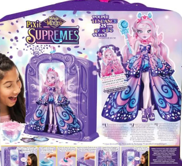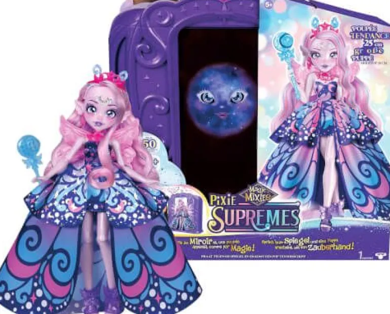 MAGIC MIXIES Fashion Doll Mirror – (FR/DE/NL) Erwecke die Magie der Pixlings und stelle einen magischen Trank, um die Puppe zu befreien – 5 Minuten Spielzeit – Es gibt zwei Nachspielmodi – Mehr als 50 Lichter und Geräusche – Wiederholtes Spiel – 9 Artikulationspunkte – Verkleide Luna mit ihrem Zubehör
