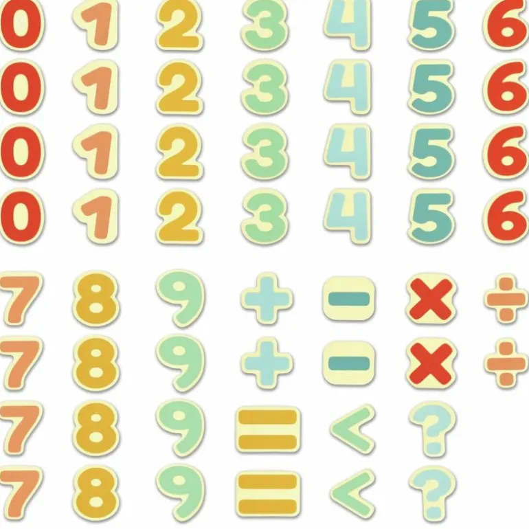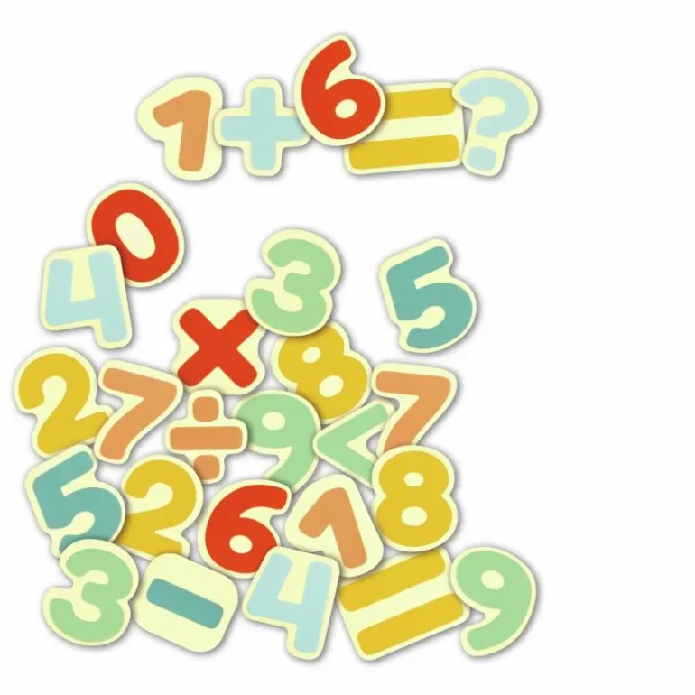 Ein Set aus magnetischen Zahlen und Zeichen, mit denen Kinder sowohl die Zahlen wie auch anspruchsvollere Rechenaufgaben zu lösen lernen.
