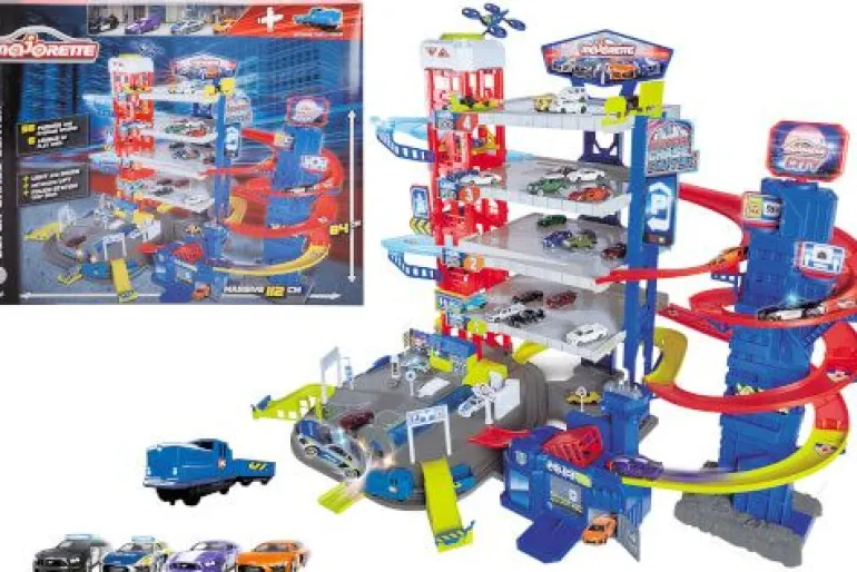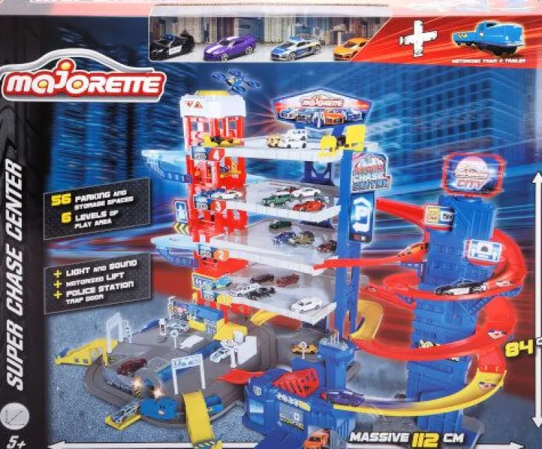 „Majorette – Super Chase Center – Parkhaus mit 6 Etagen, mit Verfolgungsjagd, Parkgarage für Kinder ab 5 Jahren, inkl. Spielzeugauto s, Zug, Aufzug, Licht & Sound
