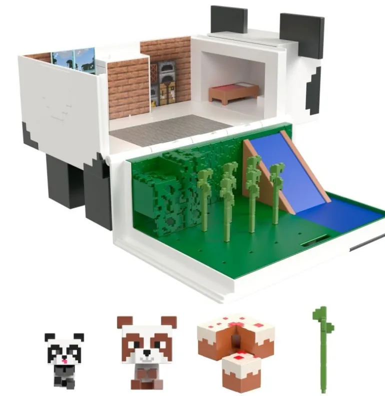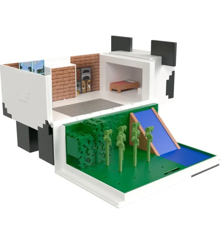 Beim Öffnen dieses riesengroßen Minecraft-Panda-Spielsets kommen ein zweietagiger Fungalow für die zum Set gehörenden Mob Head Minis Panda“ und Baby Panda“ zum Vorschein. Lass die Figuren von der oberen Etage über die Wasserrutsche“ in den Vorgarten schlittern.
