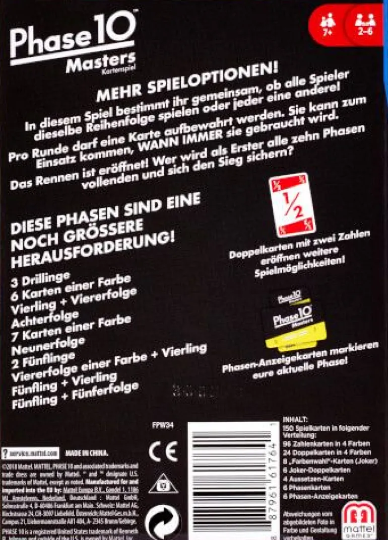 Bei der Master-Version des Rommé-ähnlichen Spiels Phase 10 gilt es, insgesamt 10 Phasen in vorgegebener Reihenfolge abzuschließen. Nachdem die Karten für eine Runde ausgegeben wurden, wählen die Spieler die Phase aus, die sie glauben, abschließen zu können. Im Verlauf des Spiels werden die Herausforderungen zunehmend größer. Eine spezielle Spielregel erlaubt es den Spielern, eine Karte pro Runde beiseitezulegen, um sie zum Abschließen späterer Phasen nutzen zu können. Wer seine Phase abschließt, darf die nächste in Angriff nehmen, wer es nicht schafft, muss es erneut versuchen. Eine spannende Herausforderung für anspruchsvolle Spieleabende.