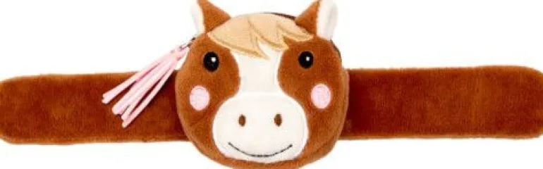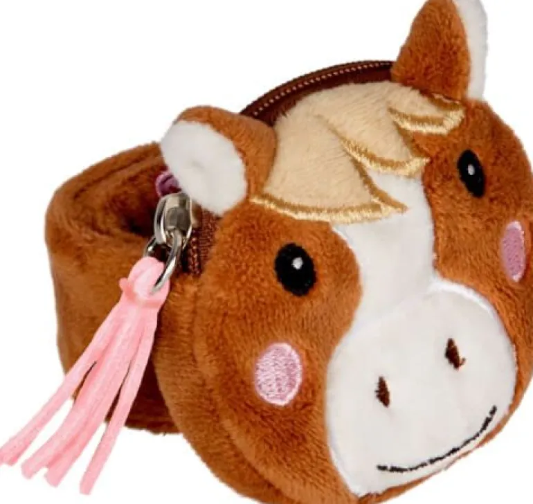 Flauschiges Schnapp-Armband mit einem süßen Pony-Kopf. Mit einer kleinen, praktischen Reißverschluss-Tasche für Kleingeld, Schlüssel und Co.