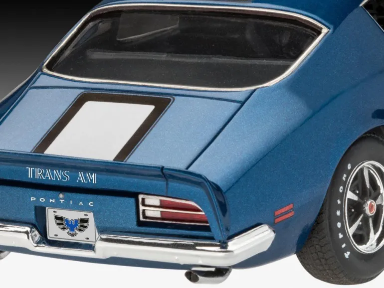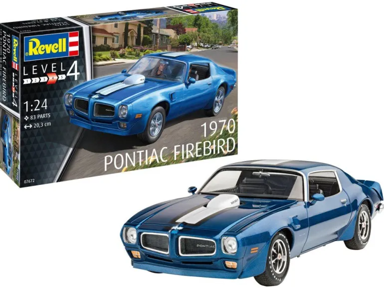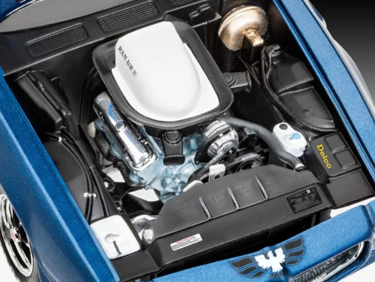 Modellbausatz zu dem Firebird, Pontiacs Beitrag zur Gattung der Pony Cars. Die 1970 erschienene, neu entworfene 2. Generation wurde nur als Coupé angeboten. – Mehrteiliger V8-Motor – Bewegliche Motorhaube – Diverse Chromteile – Wahl zwischen zwei Bemalungsvarianten – Abziehbild mit diversen Kennzeichen (D, A, NL, B, F, GB, I, CH, USA)