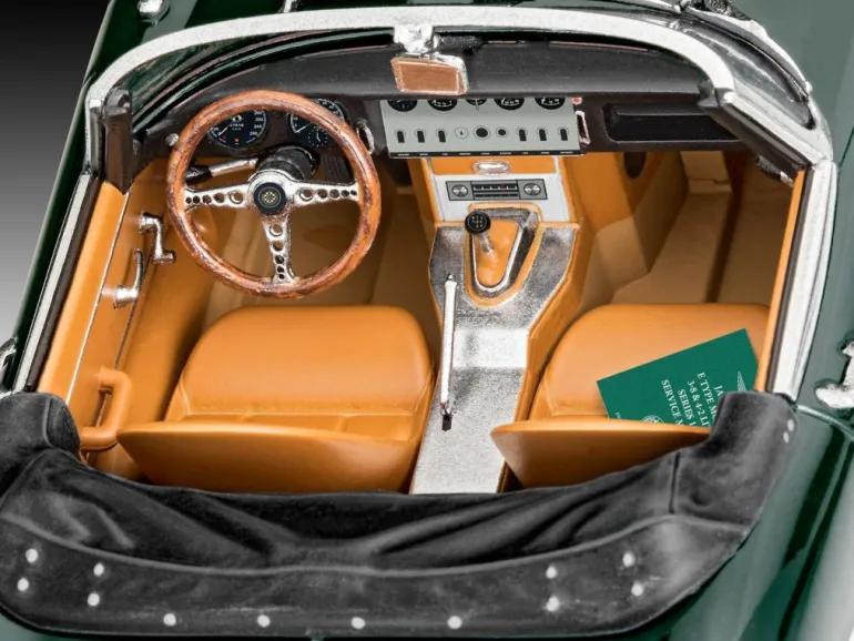 Die offene Version des Jaguar E-Types erreichte Beschleunigungs- und Fahrwerte, die in den 1960er Jahren fantastisch anmuteten. – Mehrteiliger Sechszylinder-Motor – Optional Links- oder Rechtlenker – Wahlweise offen oder geschlossen zu bauen – Abziehbilder mit diversen Kennzeichen (D, A, CH, F, B, NL, GB, I, USA)