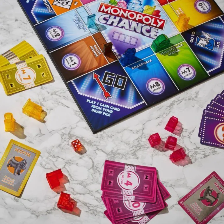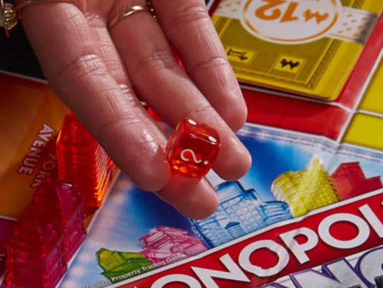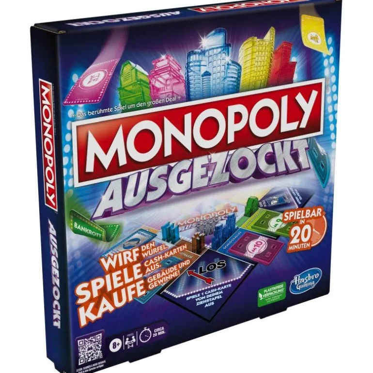 Mit jeder aufgedeckten Karte steigt die Spannung und das Risiko! Monopoly Ausgezockt ist eine schnelllebige Monopoly-Version, die mit Karten gespielt wird und nur ca. 20 Minuten dauert. Anstatt mit Spielfiguren um den Spielplan zu ziehen, erhalten alle Spieler einen Kartenstapel mit Cash-, Bankrott- und weiteren Karten (kein Spielgeld), die für Vor- oder Nachteile sorgen können. Die Spieler decken je nach Würfelwurf entsprechend viele Karten auf. Wer auf Nummer Sicher gehen will, deckt nur wenige Karten auf und ruft laut „Ausgezockt!“ – oder riskiert alles für das große Geld.