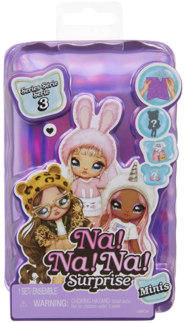 Hier kommt neuer Spielespaß für alle Na! Na! Na! Surprise Fans! Sammle deine Lieblingscharaktere in einer kleineren Größe mit den Na! Na! Na! Surprise Minis Serie 3! Mit den bezaubernden Püppchen kommt jeweils ein niedlicher Charakter der Na! Na! Na! Surprise Familie mit einem kompletten Outfit und einer tollen Konfetti-Überraschung. Für kreative Spielemomente zuhause und ein cooles Auspackerlebnis sorgen die Konfetti-Überraschung und die beweglichen Gelenke der Minis für alle möglichen Posen. – 12 süße Charaktere – Mit Konfetti-Überraschung – Ca. 10 cm große Sammelpuppe – Mit Bewegungspunkten an Kopf, Schultern und Hüfte – Beweglicher Kopf mit beflockter Mütze mit Tiermotiv – Outfits zum Tauschen und Mixen