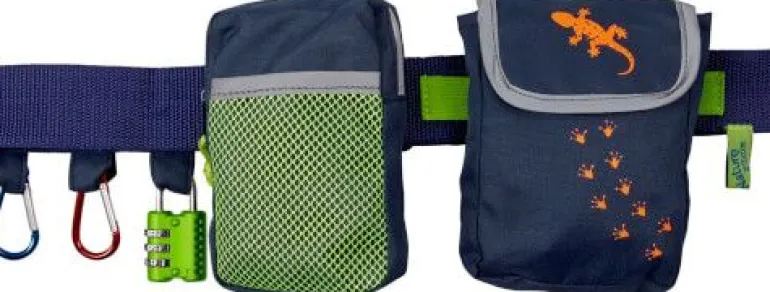 Mit verstellbarem Gurt, Reißverschluss, reflektierenden Bändern, Zahlenschloss und zwei Karabinerhaken.