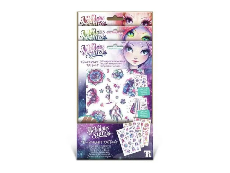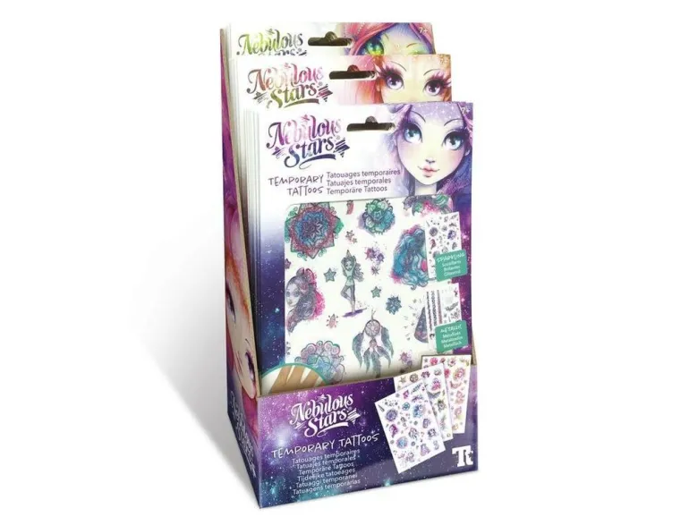 Hundert temporäre Tattoos mit tollen Motiven deiner Lieblingsfiguren. Dreimal schöner dank drei stilvollen Designs: glitzernd, metallisch und nachtleuchtend.