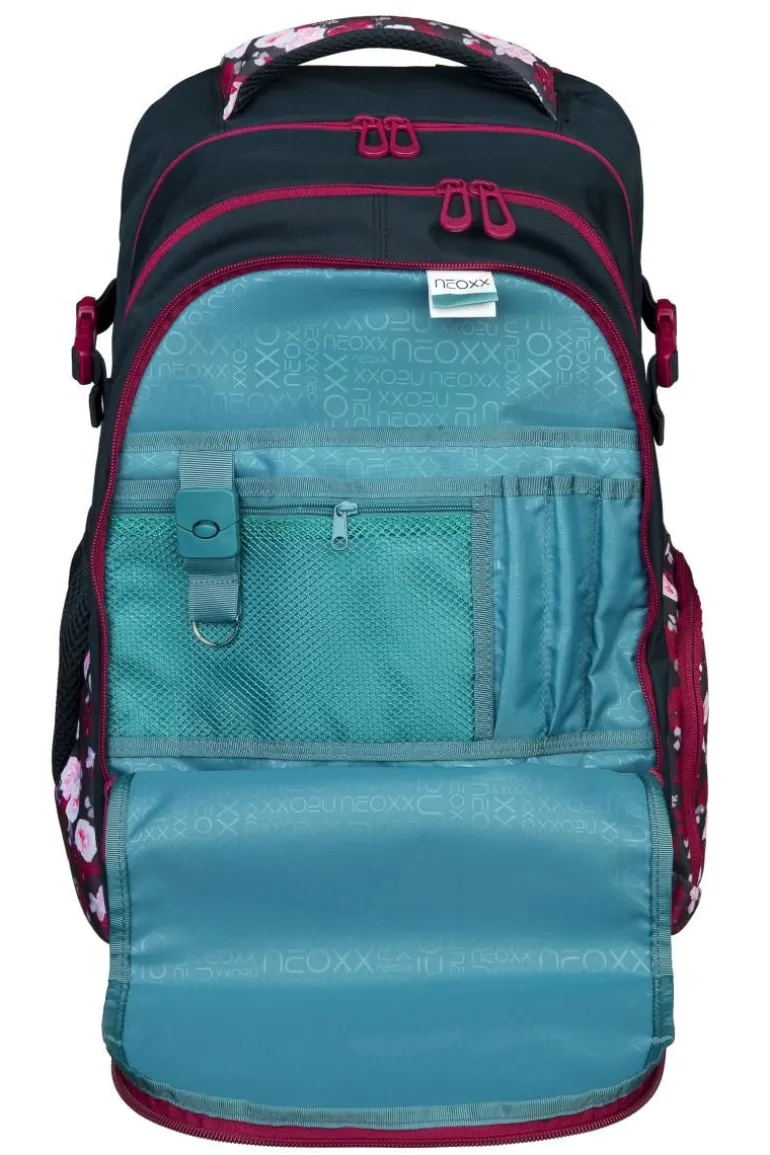 – großes Hauptfach, Fach für Hefte, Fach mit Organizer, seitliches Fach mit Reißverschluss und Seitentasche mit Gummizugband.