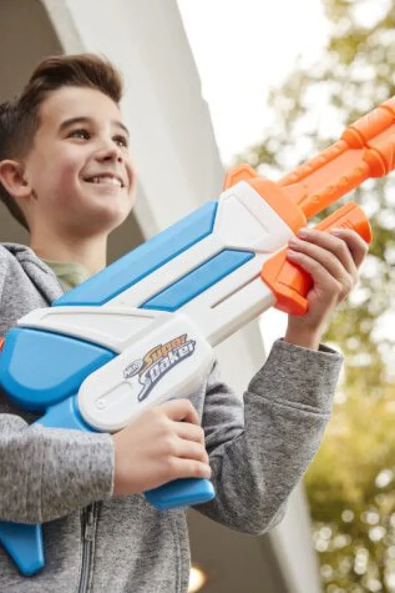Der Nerf Super Soaker Twister Wasserblaster lädt die Fans ein, 2 sich kreuzende Wasserstrahlen abzufeuern. Dieser Super Soaker Blaster sorgt für jede Menge Action bei Outdoor Wasserschlachten. Wenn der Griff gepumpt wird, rotiert eine Trommel vorne am Lauf und sorgt für eine doppelte Wasser-Attacke, die die Mitspieler in den Schatten stellt. Der Twister Wasserblaster bereichert die Wasserschlachten mit seinen sich kreuzenden Wasserstrahlen.