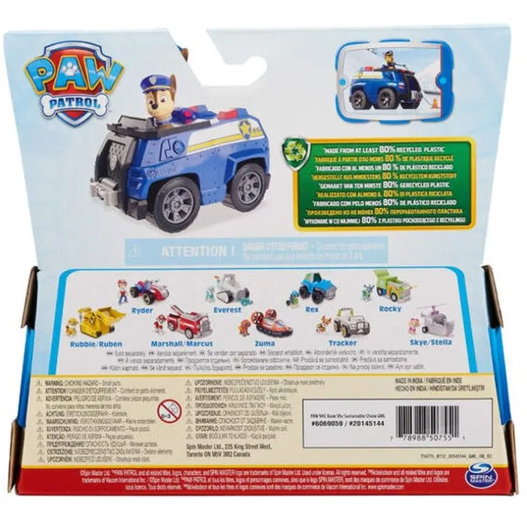 Chase und sein Fahrzeug wurden nachhaltig hergestellt und bestehen zu 80% aus recyceltem Kunststoff. Zusammen mit den anderen Welpen und ihren Rettungsfahrzeugen (jeweils separat erhältlich) kann der Tag in Adventure Bay gerettet werden.