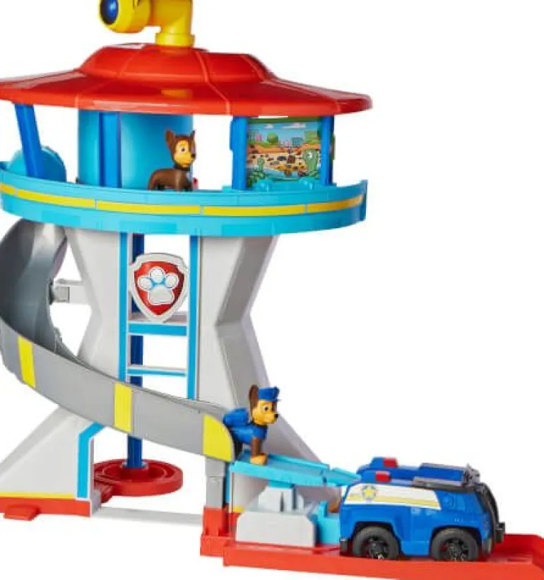 Der Wachturm ist ca. 50cm hoch und bietet den optimalen Aussichtspunkt, um alle Ereignisse zu überblicken. Wenn es Zeit für den nächsten Rettungseinsatz ist, wird der Chase ohne Uniform auf die Vorderseite des Aufzugs im Turm gesetzt, während der Helden-Chase auf die Rückseite gestellt wird. Den Aufzug anheben, sodass er sich dreht, und schon verwandelt sich der normale Chase zum uniformierten Helden-Chase. Wenn Chase die Spitze des Wachturms erreicht hat, sollte er beim Steuerpult vorbeischauen, um die Mission des Tages mittels Auftragskarten auszusuchen. Nachdem die Auftragskarte ausgewählt wurde, wird eine der Fernrohrkarten ausgewählt, um sie durch das drehbare Fernrohr anzusehen – man muss schließlich wissen, wo man hin muss. Wenn Chase zur actiongeladenen Rettung starten soll, schiebt man ihn die Rutsche am Hauptquartier hinunter, sodass er direkt in sein Polizei Fahrzeug springen kann. Dann einfach auf die Abschussvorrichtung für das Fahrzeug drückenu nd schon geht es los.