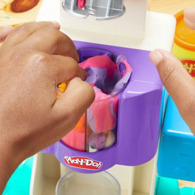 Play-Dohs Bunte Regenbogen Eismaschine lädt zum fantasievollen Spielen ein! Einfach 2 oder mehr Farben Play-Doh in die Maschine geben, den Griff drücken und schon füllt Regenbogen-Softeis den drehenden Becher oder die Eistüte. Kinder können Streusel und andere Play-Doh Lebensmittel wie Brezeln, fantasievolle Früchte und verrückte Süßigkeiten gestalten, um ihre Kreationen zu verzieren. Dieses Spielzeugeis-Set enthält einen Löffel, ein Knetmesser, eine Streusel- Schaufel, eine Eisschale, eine Eistüte und einen Becher mit Deckel, sodass Kinder Eisdiele spielen und sich vorstellen können, ihre Play-Doh Kreationen zu servieren. Dieses Play-Doh Set enthält 284 Gramm Play-Doh Spielknete, darunter 3 zweifarbige Dosen, mit der sich mehrfarbige Eiskreationen und Dekorationen herstellen lassen. Spielzeug-Küchengeräte wie dieses Play-Doh Küchenset für Kinder sind tolle Geschenke für Mädchen und Jungen ab 3 Jahren. PLAY-DOH und HASBRO sowie alle dazugehörigen Marken und Logos sind Marken von Hasbro, Inc.