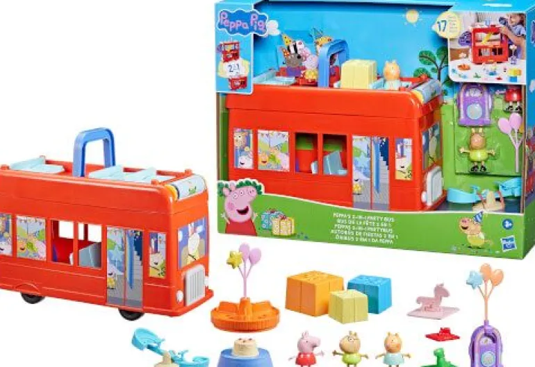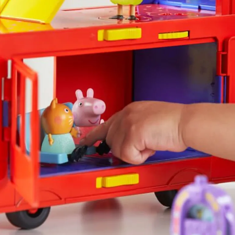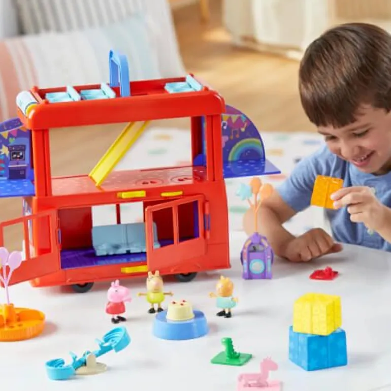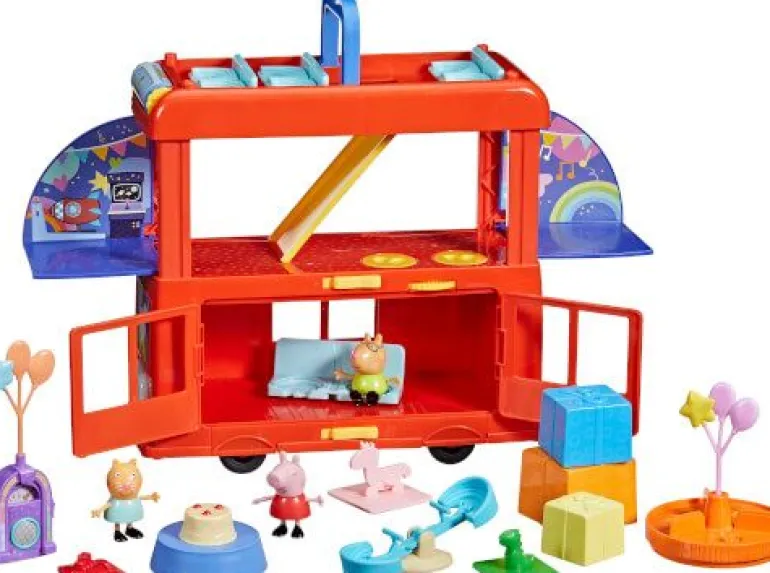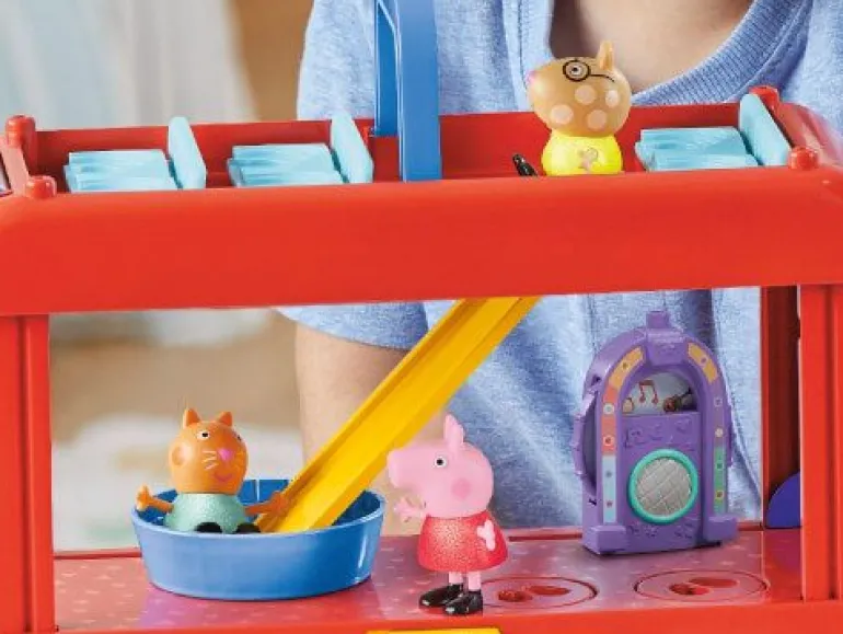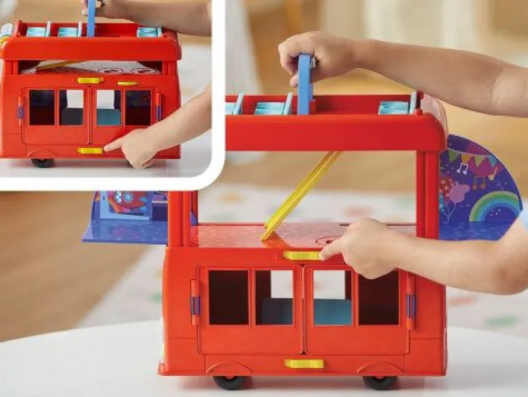 Mit Peppas 2-in-1 Partybus werden Kinder zu Party-Abenteuern eingeladen! Kinder können sich vorstellen, wie Peppa mit ihren Freunden oben in dem fröhlich roten Doppeldeckerbus tourt, dann den Bus aufklappen und in ein Party-Spielset verwandeln. Dank zahlreicher Besonderheiten ist Spielspaß auf 3 Stockwerken geboten. Was werden die Figuren von Peppa Wutz, Klausi Kläff und Mollie Mieze wohl als Nächstes unternehmen? Wie wäre es mit einer Tanzparty auf den wirbelnden Tanzflächen? Oder mit einer Fahrt auf dem Karussell? Oder einer Rutschpartie? Kommen die Ballons oben auf den Bus oder über die Jukebox? Mit den 3 Peppa Pig Figuren und 13 Party- Accessoires, bleibt es den Kindern überlassen, die Party in Szene zu setzen. Peppa Pig Spielzeug für Mädchen und Jungen ab 3 Jahren eignet sich hervorragend als Geschenk für Kinder, die die Serie lieben! © 2023 ABD Ltd/Hasbro/HCPL Ltd. HASBRO und PEPPA PIG und alle dazugehörigen Marken TM & © 2023 Hasbro/Hasbro Consumer Products Licensing Ltd.