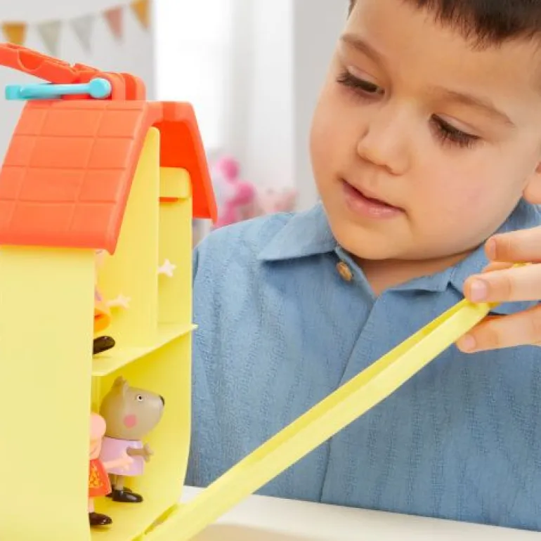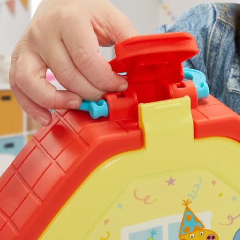 PEP PePeppas Partyhaus für unterwegs Mit PePeppas Partyhaus für unterwegs kann die Party überall stattfinden! Dieses kleine Peppa Pig Spielset kommt mit einem Koffer, der als Peppas Spielhaus verwendet werden kann, das die Kinder zum Party-Geschichten erzählen einlädt, sowie mit 4 beweglichen Figuren in Partyoutfits. Wenn das Haus zu ist, können sich die Kinder vorstellen, wie Zoë Zebra, Wendy Wolf, Lotte Lama und Peppa Wutz eine Party im Garten feiern! Klappen sie die Vorderseite des Hauses herunter, können sie sich Partys im Haus ausdenken, das mit hübschem Spiel-Leckereientisch und heiter verpackten Geschenken aufwartet. Wenn die Spielzeit vorbei ist, lassen sich die Figuren praktisch im Haus aufbewahren und zu Spieltreffen oder als Spielzeug für die Reise mitnehmen. Das Peppa Pig Spielzeug für Mädchen und Jungen ab 3 Jahren ist ein tolles Geschenk für Kinder, die die Serie Peppa Wutz lieben. © 2023 ABD Ltd/Hasbro/HCPL Ltd. Hasbro sowie alle dazugehörigen Marken und Logos sind Marken von Hasbro, Inc.