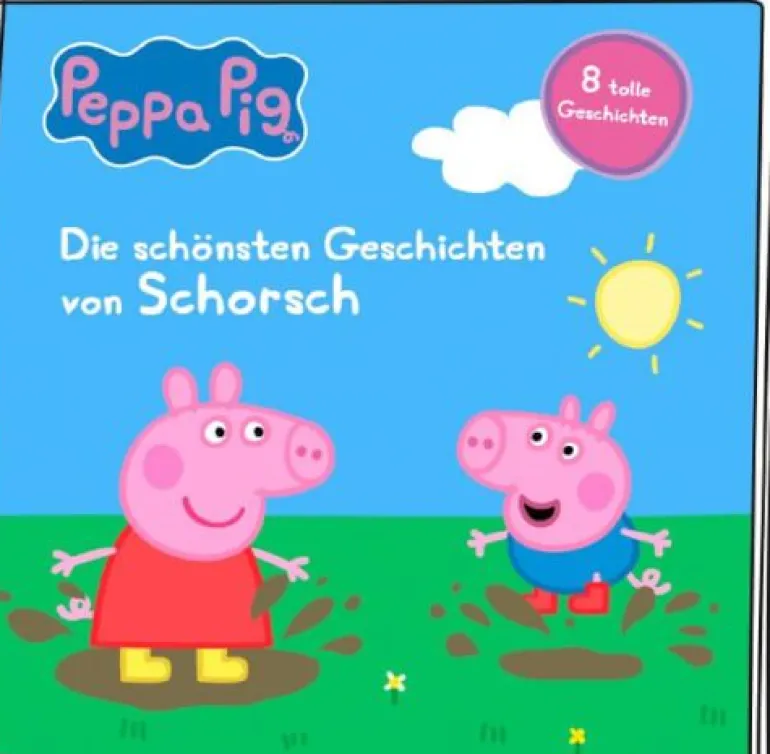 ““Hörfigur für die Toniebox: Kurze Geschichten für große Schweinchen-Fans – Peppa und ihre Familie und Freunde kommen auf die Toniebox! Sie ist klein, pink und liebt Matschepfützen über alles: Peppa Wutz begeistert mit ihren kurzen Geschichten schon die kleinsten Hörspielfans. Und jetzt kommt ihr kleiner Bruder Schorsch. Erlebt mit ihm und Peppa tolle Abenteuer: es geht zu Opi Mümmels Leuchtturm, zu Edmund Elefants Geburtstagsparty oder ins aufregende Mini-Land– stell Schorsch einfach auf deine Toniebox und begleite ihn und seine Familie und Freunde auf 8 lustigen Abenteuern. 1. Baby Alexander Peppas Cousine und Cousin kommen zu Besuch. Doch mit Baby Alexander ist zu klein und kann noch nicht sprechen. Bis Peppa ihm sein erstes Wort beibringt. 2. Champion Pappa Wutz Als Papa seinen Titel als Champion im Matschpfützenspringen verliert, ist er sehr traurig. Bis ihm alle dabei helfen, den Titel zurückzuholen. 3. Schakka-Lakka-Bumm Madame Gazelle bringt Instrumente mit in die Spielgruppe, damit die Kinder musizieren können. Die Instrumente machen „schakka und „lakka und „bumm! 4. Der Laster von Herrn Fuchs Herr Fuchs bringt Freddie zu Peppa, damit die Kinder Fahrrad fahren können. Und alle Kinder versuchen zu erraten, was Herr Fuchs wohl alles in seinem großen Laster haben könnte! 5. Sonne, Strand und Schnee Peppa, ihre Freunde und ihre Familie freuen sich auf einen Ausflug zum Meer. Aber als sie dort ankommen, liegt am Strand Schnee! 6. Opi Mümmels Leuchtturm Opa Wutz nimmt Peppa, Schorsch und Klausi Kläff mit auf einen Auszuflug zu Opi und seinem Leuchtturm. 7. Edmund Elefant feiert Geburtstag Peppa und ihre Freunde helfen bei der Geburtstagsparty von Edmund Elefant, aber das ist schwieriger, als sie gedacht hatten… 8. Das Mini-Land Es ist Zeit für einen Tagesausflug und Peppa, George, Mama Wutz, Papa Wutz und Luzie Locke besuchen das Mini-Land. Sie sehen winzige Dinosaurier, ihre liebsten winzigen Wahrzeichen und sogar ein kleines Fräulein Löffel! ““