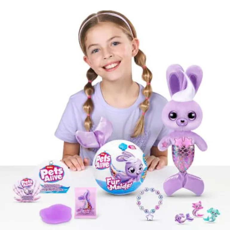 Lerne die süßen Meerjungfrauen, die Pets Alive Furmaids kennen! Purrl, Dazzi und Starlet sind bereit, mit dir auf ein magisches Meerjungfrauen-Abenteuer zu gehen! Erlebe ultimatives Sommerfeeling mit tropischen Beats und Meerjungfrauen-Melodien. Deine kuschelige Meerjungfrau lädt dich zum Tanzen ein! Die Aufregung geht weiter mit über 10 Überraschungen zum Auspacken, einschließlich glitzerndem Meerjungfrauen-Accessoires. Deine Kuschelfreunde haben einen mit Pailetten besetzten Schwanz für ganz viel Unterwasser-Glamour! Viel Spaß mit den süßen Meerjungfrauen! Sammle sie alle 3!