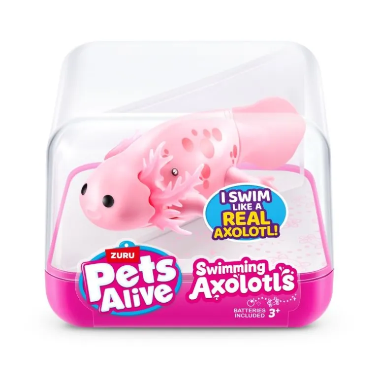 Tauche mit Pets Alive Swimming Axolotls in eine zauberhafte Unterwasserwelt ein. Mit der fortschrittlichen, durch Wasser aktivierten Technologie von ZURU wird dieser niedliche Freund zum Leben erweckt, wenn er ins Wasser gesetzt wird und dann in bis zu 5 verschiedene Richtungen schwimmt! Welche Farbe soll dein Axolotl haben?
