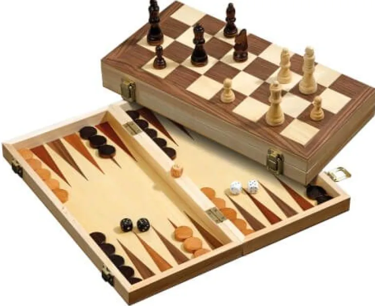 Kassette: Pappel, matt versiegelt, Maße 355 x 178 x 50 mm. Außen: Schach und Dame, Feld 40 mm, Ahorn- und Walnuss-Intarsien. Figuren: Design Staunton, Schima-Holz, natur und braun gebeizt, Filzsockel, König 76 mm. Innen: Backgammon, Intarsien, mit Spielsteinen und Würfel. Backgammon, Schach und Dame sind spannende Strategiespiele für zwei Personen. Die Spiele haben einfache Regeln und Sie können sofort mit Ihrer ersten Partie beginnen.