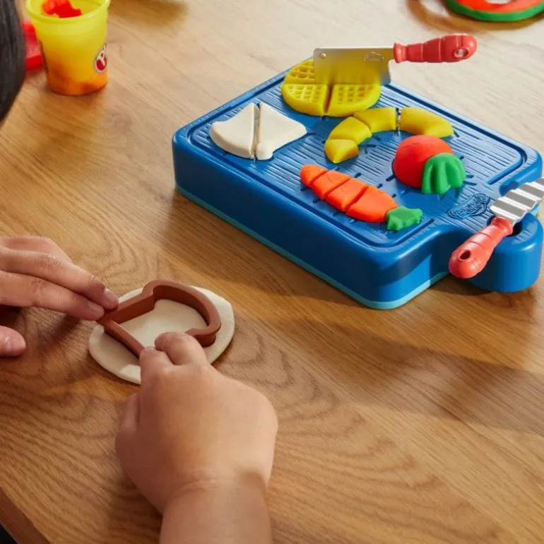 Mit Knetwerkzeugen wie Knoblauchpresse, Eierschneider und Halbformen an der Unterseite des Schneidebrett-Deckels entstehen so allerlei lustige Play-Doh Gerichte. Das Küchen-Spielset enthält sogar Teller, damit kleine Nachwuchsköche ihre Kreationen stolz präsentieren können. Egal, ob es sich um ihr erstes Play-Doh Set für Einsteiger oder um ein Geschenk für Kinder ab 3 Jahren handelt, hier können Kinder die Freude an Play-Doh Spielzeug entdecken. Hasbro, Play-Doh sowie alle dazugehörigen Merkmale sind Marken von Hasbro.