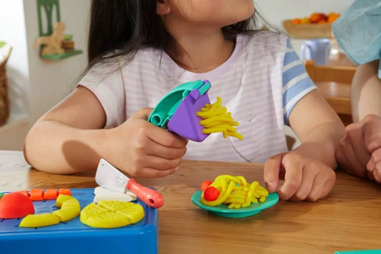Wer ist heute der Chefkoch? Das „Kleiner Chefkoch Starter-Set“ ist mit 14 Küchen-Accessoires und 5 Play-Doh Farben wie gemacht für kleine Hobbyköche. Hier können Kinder mit den Formen und Ausstechern das Gemüse und Obst gestalten und es dann mit den Rillen im Schneidebrett und dem Knetmesser zerteilen.