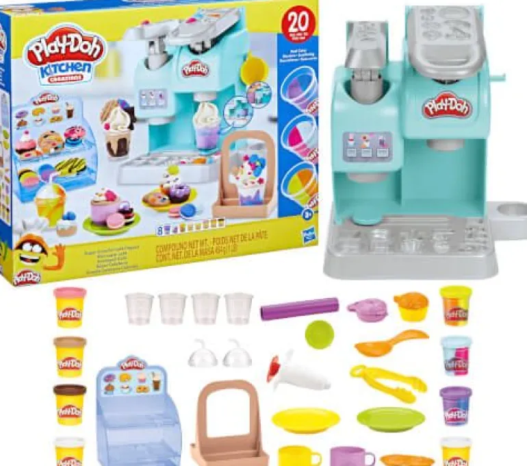 Das Knetspaß Café ermöglicht kleinen Baristas, in ihrem eigenen Café fantasievolle Play-Doh Getränke zu servieren. Mit dem Spielzeug Kaffee- Automaten lassen sich Becher mit bunter Spielknete füllen, drehen, zur Topping-Station verschieben und mit Play-Doh Knete im Look von Sahne frisch und fröhlich dekorieren. Mit weiteren Formen entstehen Cookies, Cupcakes und Donuts und können auf dem durchsichtigen Törtchenständer stolz präsentiert werden. Egal, ob Kinder Play-Doh Kaffee, Tee, Eiskaffee, Frappés oder Smoothies kreieren, sie können immer wieder Spaß daran haben, Barista zu spielen. Dieses Spielzeug aus der Play-Doh Knetküche eignet sich für Kinder ab 3 Jahren und enthält 8 Play-Doh Dosen und 20 Accessoires, um die kindliche Fantasie anzuregen. Hasbro, Play-Doh, and all related properties are trademarks of Hasbro.