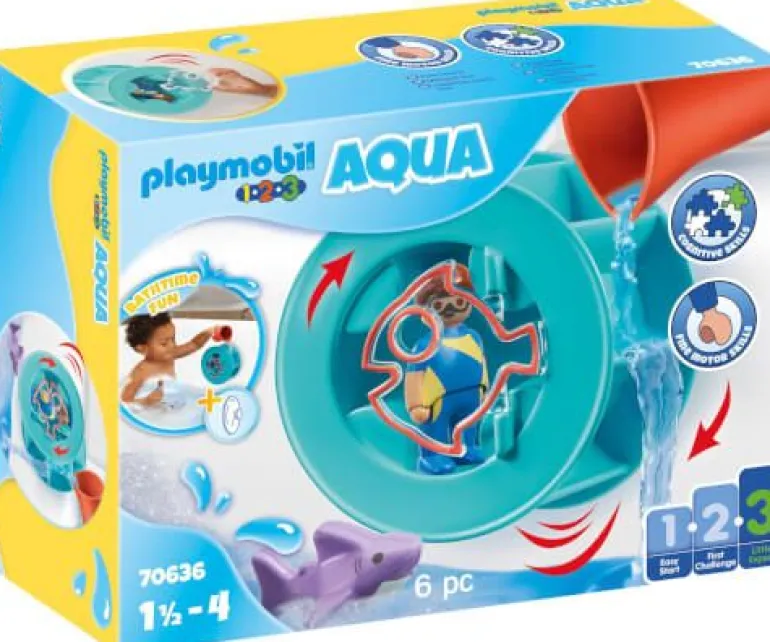 Bereit für lustige Wasserexperimente? Dann sind die Spielsets von PLAYMOBIL 1.2.3 AQUA genau das Richtige. Das Wasserwirbelrad mit Babyhai bringt maximales Planschvergnügen in die Badewanne. Einfach das Wasserrad mit dem Saugnapf an Badewannenrand oder Fliese befestigen, Figur einsetzen und Türe schließen. Wird nun der rote Becher mit Wasser gefüllt und das Wasser in die Radschaufeln gegossen, setzt sich das Rad in Bewegung. Die lustige Wirbelfahrt beginnt!