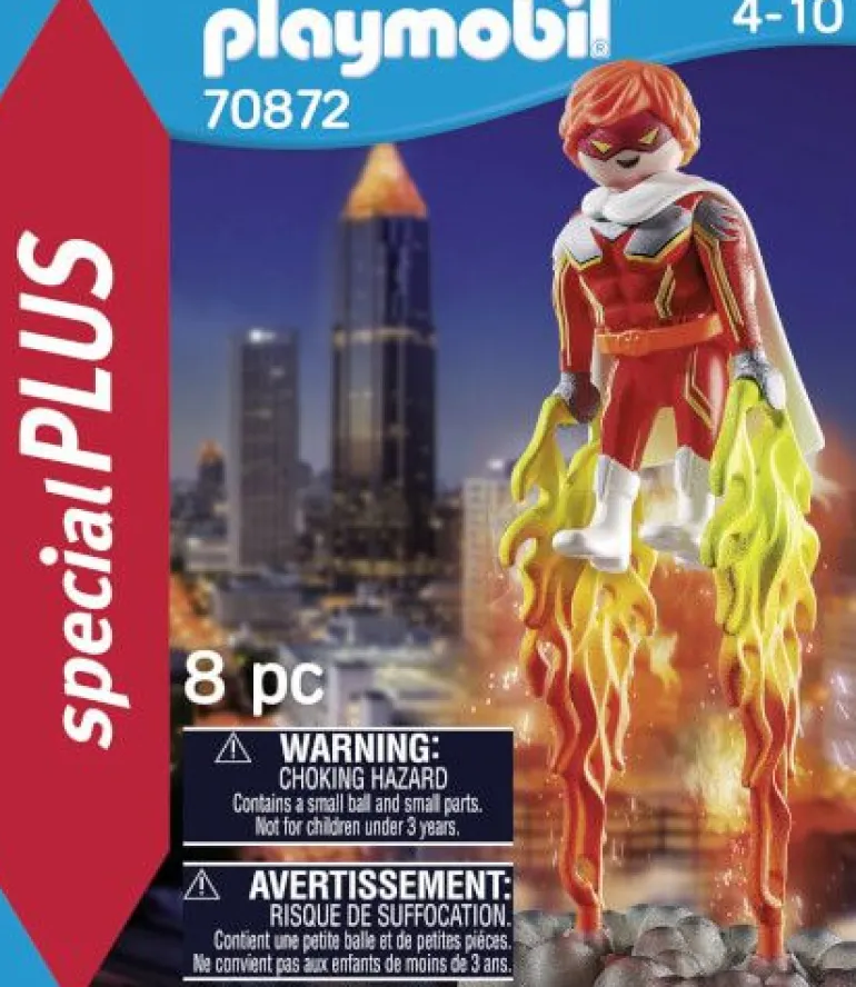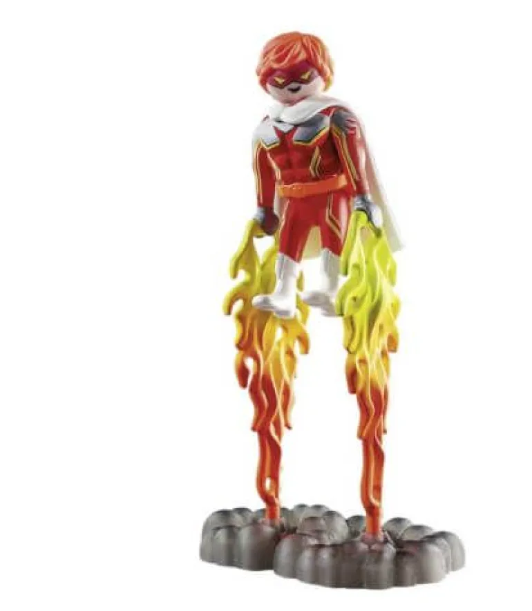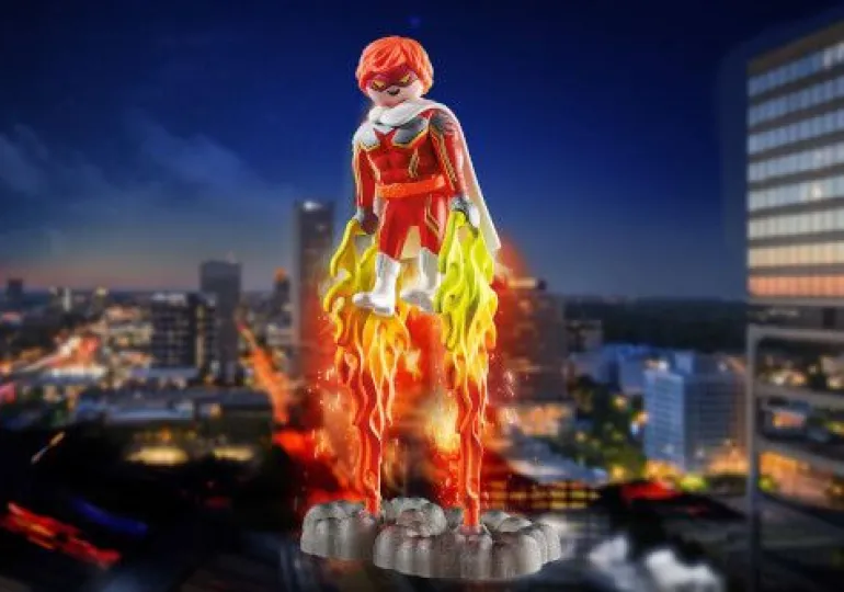 Mit Hilfe der Feuerflammen fliegt er durch die Lüfte.