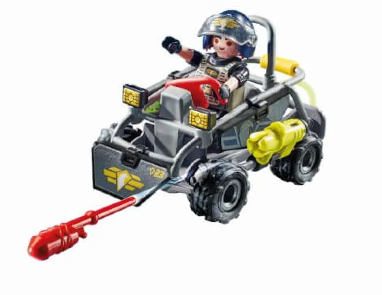 • Das 59-teilige Polizei-Spielzeug enthält einen verwandelbaren Buggy mit ansteckbarer Kanone, Dynamit, SEK-Ausrüstung und eine PLAYMOBIL-Figur
