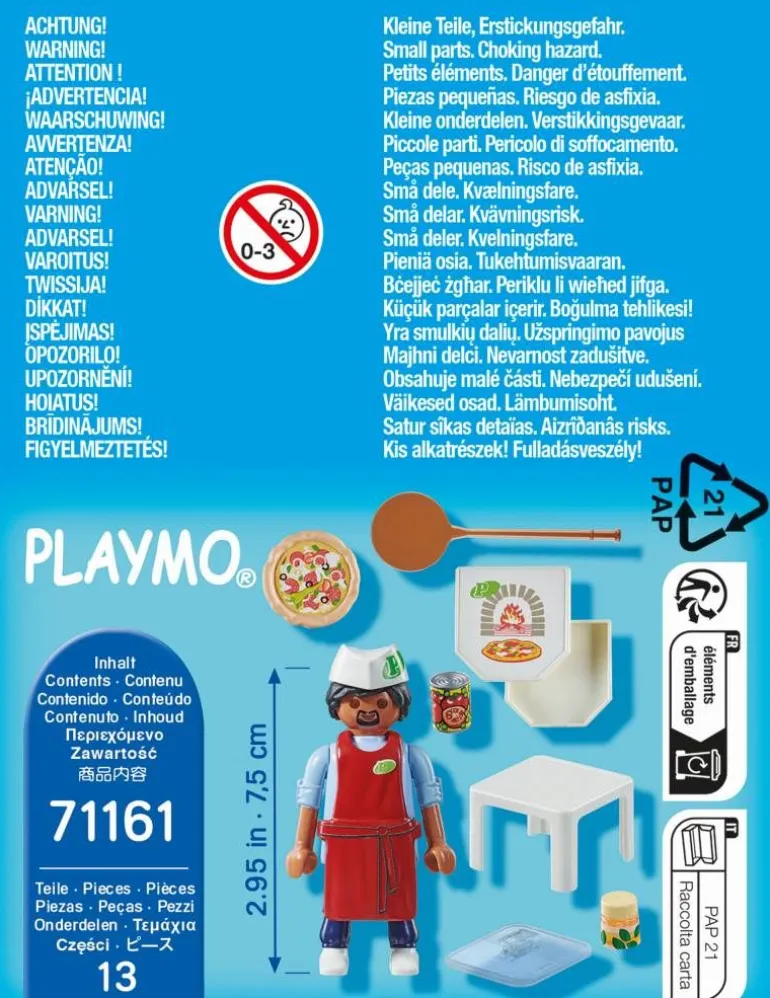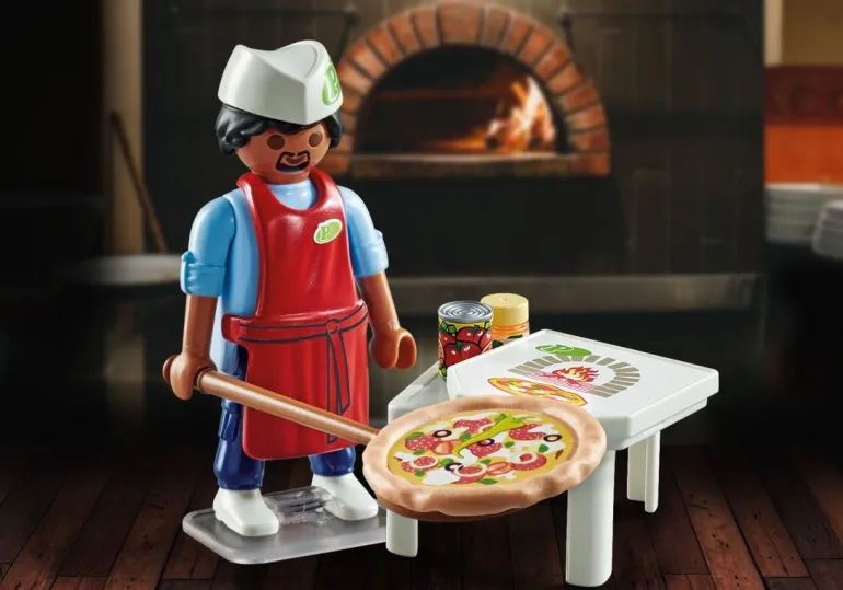 Figuren: 1 Pizzabäcker Zubehör: 1 Pizzabäckerhut, 1 Pizzabrett, 1 Pizzakarton, 1 Dosentomaten, 1 Tisch, 1 Mozzarella, 1 Standplatte