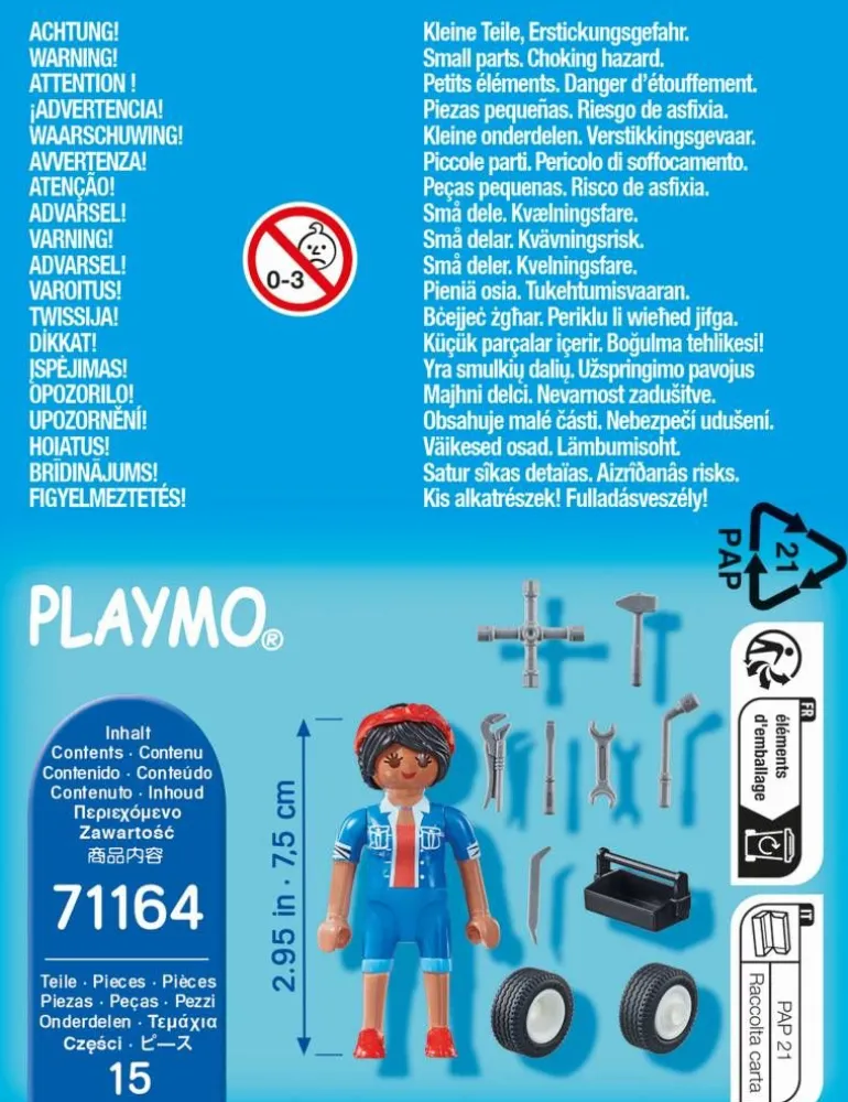 Figuren: 1 Mechanikerin Zubehör: 2 Reifen, 1 Werkzeugkoffer, 1 Werkzeug-Set