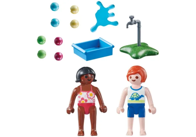Figuren: 1 Mädchen, 1 Junge Zubehör: 1 Wasserhahn, 1 Wasserpfütze, 1 Behälter, 8 Wasserbälle