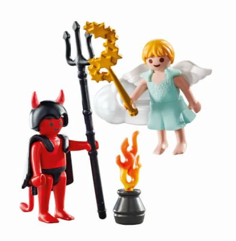 Äußerlich sind sie zwar sehr verschieden, aber eigentlich sind Engelchen und Teufelchen gute Freunde. Heute treffen sie sich mal wieder zu einem kleinen Plausch. Während sich das Teufelchen am Feuer wärmt, nimmt das Engelchen auf einer gemütlichen Wolke Platz.