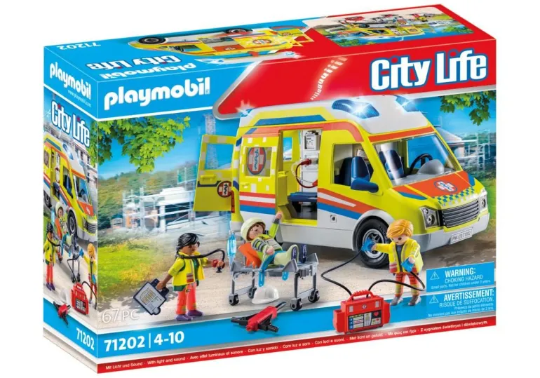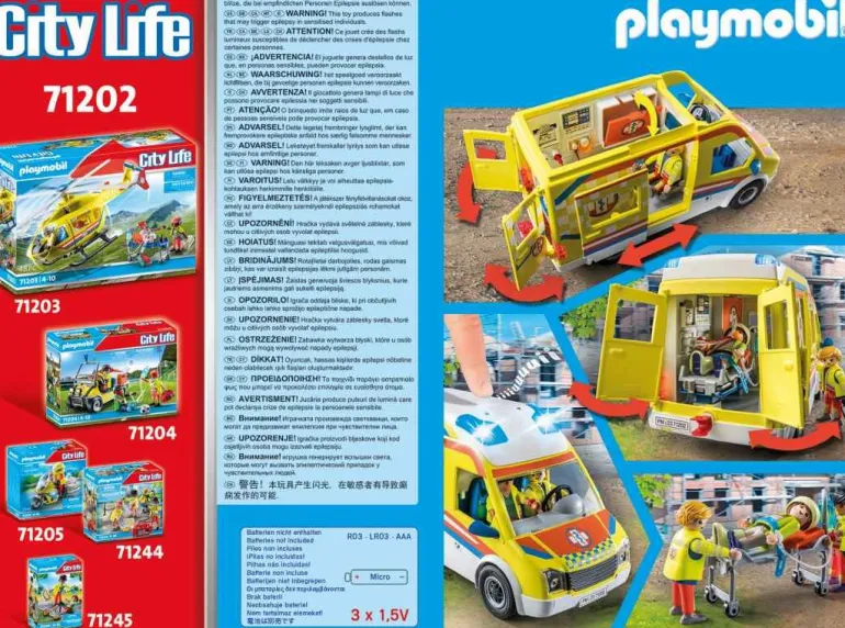 Figuren: 1 Sanitäterin, 1 Sanitäter, 1 Verletzter Zubehör: 1 Rettungswagen mit Licht- und Soundmodul, 1 Krankentransportliege, 1 Infusionsbeutel mit Infusionsschlauch,1 Defibrilator, 1 Dokumentationsmappe, 3 Diagnosetafeln, 3 Schienenverbände, 1 Bauhelm, 1 Luftdruckhammer, 1 Kopfverband, 2 Gipsverbände, 1 Etikettenbogen mit Verbandmaterial, 1 Armbanduhr, 1 Stetoskop
