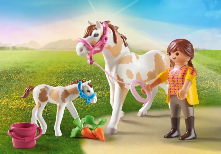 Figuren: 1 Frau Tiere: 1 Pferd, 1 Pfohlen Zubehör: 2 Halfter, 1 Zügel, 1 Eimer, 2 Karotten