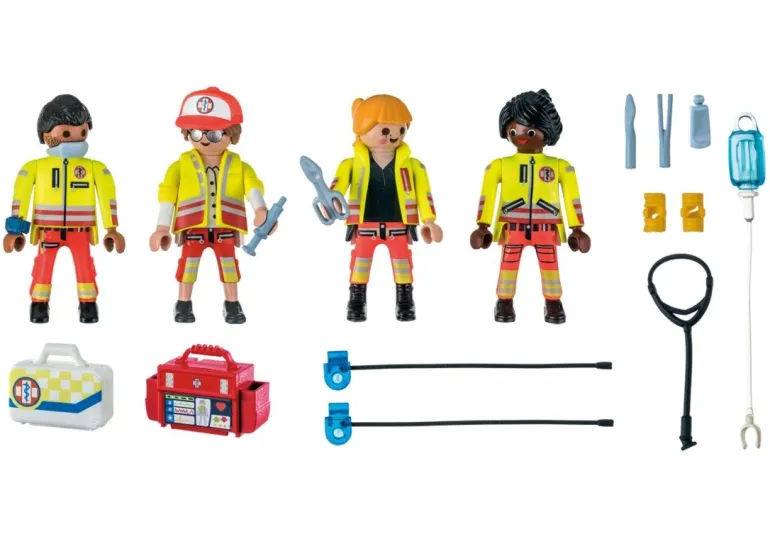 Figuren: 2 Männer, 2 Frauen Zubehör: 1 Infusion mit Infusionsschlauch, 1 Stetoskop, 1 Erste Hilfe Instrumente, 2 Verbandsschienen, 1 Wasserflasche, 1 Defibrilator, 1 Verbandskoffer, 1 Cap, 1 Armbanduhr