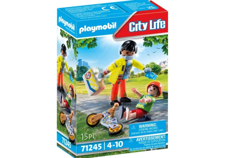 Figuren: 1 Sanitäter, 1 verletztes Kind Zubehör: 1 Roller, 1 Verbandskoffer, 2 Verbandsschienen, 1 Helm, 1 Etikettenbogen mit Verbandsmaterial