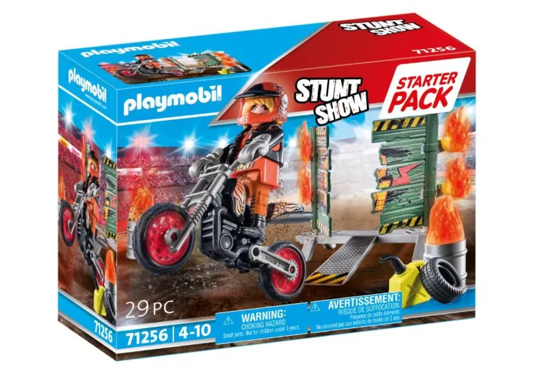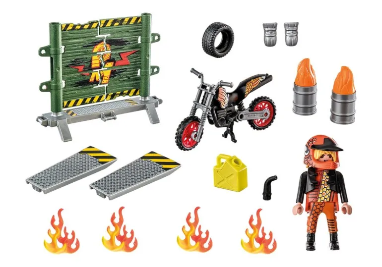Figuren: 1 Mann Zubehör: 1 Motorrad, 1 Helm, 1 Handschuhe, 1 Kanister, 1 Reifen, 2 Feuertonnen, 1 Feuerwand mit Rampe