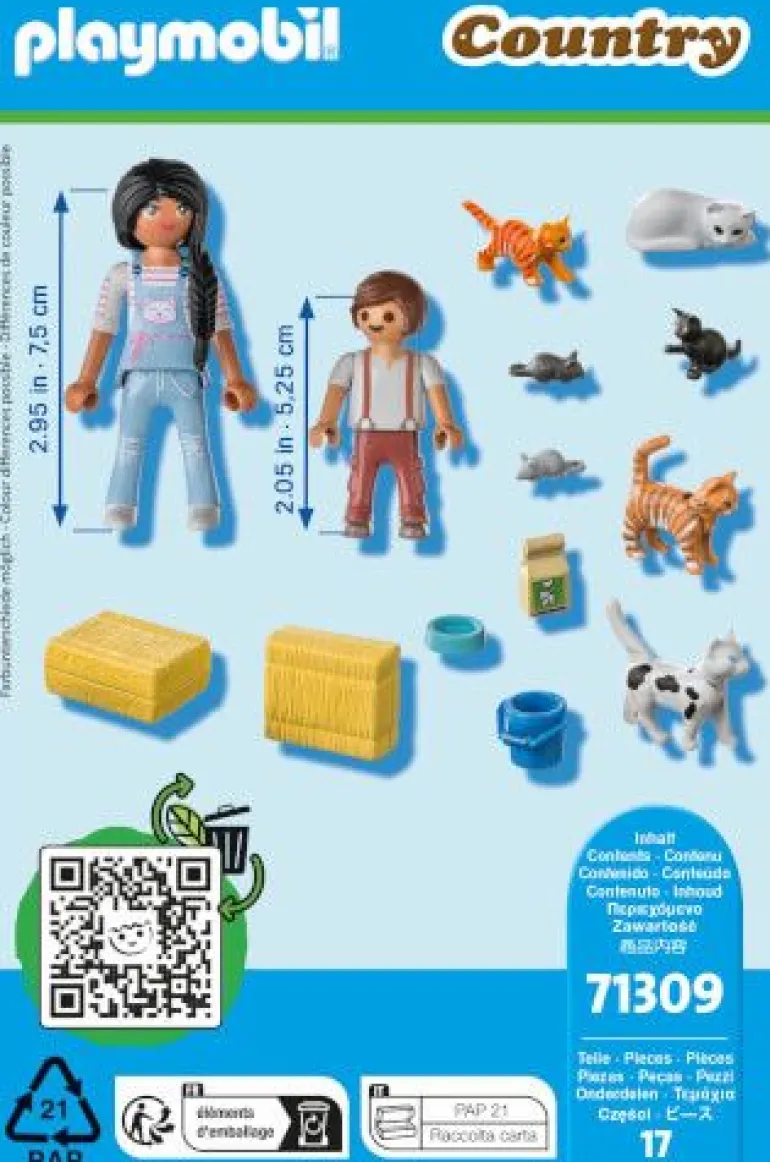 Das 17-teilige Spielfigurenset enthält zwei PLAYMOBIL-Figuren, drei Katzen, zwei Katzenbabys, zwei Mäuse und weitere Extras.