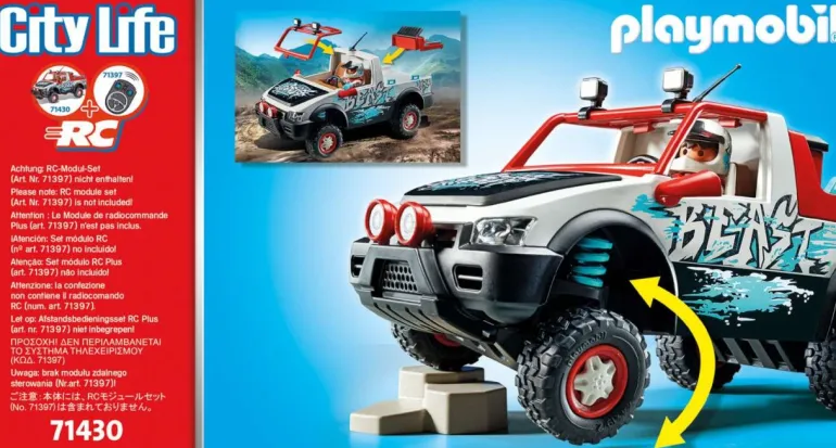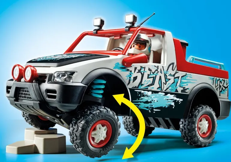 Wird die Motorhaube geöffnet, gibt sie den Blick auf den Motorblock frei. Zum Einsetzen der Figuren wird der Überrollbügel abgenommen. Der Pickup ist RC-fähig und kann sowohl mit dem RC-Modul-Set 2,4 GHz (6914) als auch mit dem RC-Modul-Set Bluetooth (71397) kombiniert werden. Ein tolles Spielset für actionreichen Rollenspielspaß im Kinderzimmer.