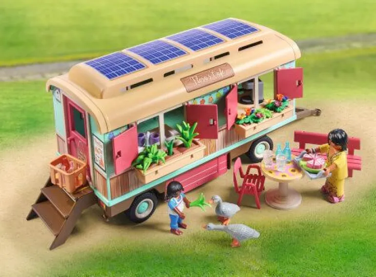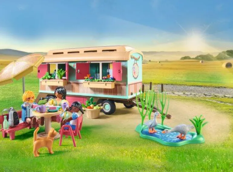 Das Spielzeugset enthält drei PLAYMOBIL-Figuren, zwei Gänse, einen Wohnanhänger, eine Sitzgruppe mit zwei Stühlen und Tisch, Blumenkästen und viele weitere Extras. Der Innenraum des Wohnanhängers kann mit den beiliegenden Etiketten nach Belieben dekoriert werden. Alle Sets der neuen PLAYMOBIL Country Spielwelt bestehen im Schnitt zu über 80 % aus recycelten und biobasierten Materialien.“