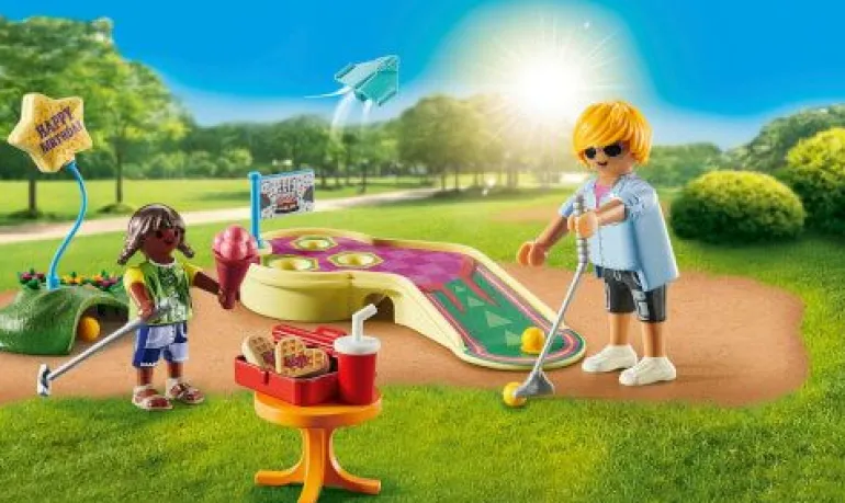 Stundenlangen Spielspaß für Minigolffans gibt es mit dem tollen PLAYMOBIL-Geschenkset Minigolf. Dank der dekorativen Verpackung, die mit dem Namen des Geburtstagskindes beschriftet werden kann, spart man Gechenkpapier. Die Minigolfbahn hat einiges zu bieten: Der vordere Bereich ermöglicht das perfekte Platzieren des Balls für den Abschlag, während auf der oberen Ebene drei weitere Mulden als Ziellöcher warten. Der Durchgang unterhalb der Bahn kann als Tunnel genutzt werden, und der Hügel dient als zusätzliches Ziel. In der zweiteiligen Dose können die süßen Waffelherzen verstaut werden, während die Golfschläger, der Papierflieger, die Eistüte, der Getränkebecher und die Luftballonschnur praktische Griffe haben und von den Figuren in der Hand gehalten werden können.