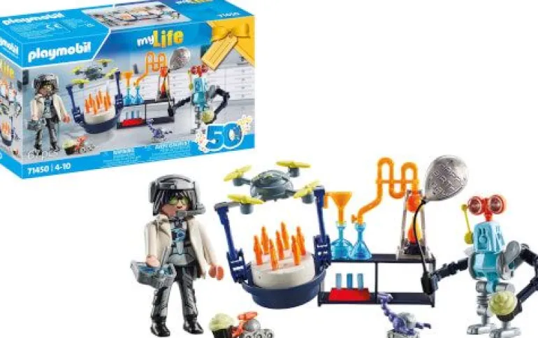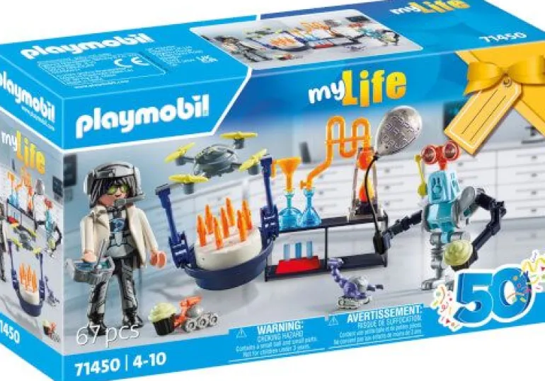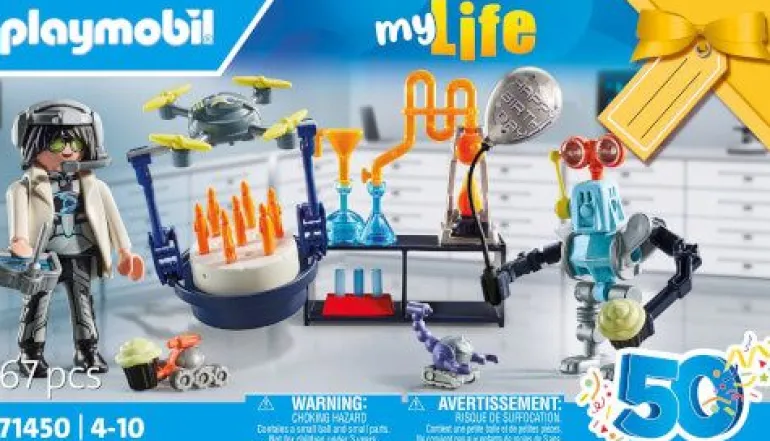 Tauche ein in die aufregende Welt der Forschung und Robotik mit dem PLAYMOBIL Geschenkset Forscher mit Robotern. Dank der schicken Verpackung kann nicht nur Geschenkpapier gespart, sondern auch eine coole Wissenschaftsparty gefeiert werden. Der Forscher feiert seinen Geburtstag im Labor, und seine Roboterfreunde sind bereit, die Feier zu rocken. Die Drohne bringt eine köstliche Torte, während die Mini-Roboter mit Muffins auftauchen und der große Roboter den Partyluftballon stolz in der Hand hält. Die kleine Drohne ist mit ihren drehbaren Rotorblättern ein wahres Flugwunder und kann per Fernsteuerung gesteuert werden. Das Gestell wird einfach unten an der Drohne angebracht. Der vielseitige Roboter kann stehen oder sitzen und seine Arme an den Schultern bewegen sich, während die Hände in alle Richtungen gedreht werden können. Wenn er sich setzen soll, wird einfach das Beinteil nach oben geklappt. Mit diesem Geschenkset wird Forschen zum Kinderspiel. Eine tolle Überraschung für wissenschaftsbegeistere Kinder ab 4 Jahren.